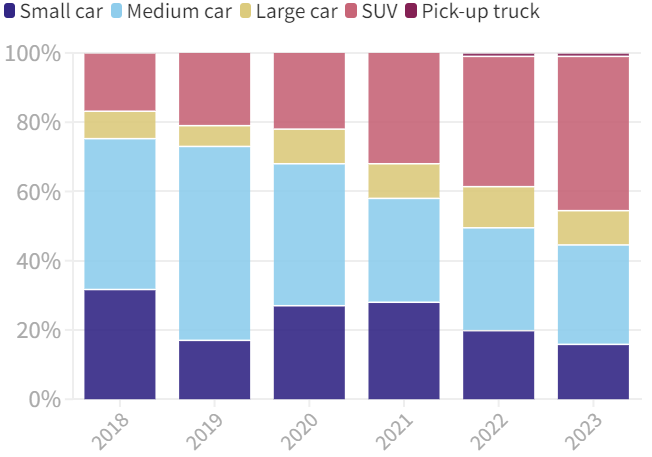 A livello globale, i SUV rappresenteranno quasi il 50% delle vendite di nuovi veicoli elettrici nel 2023, rispetto a poco meno del 20% nel 2018, secondo il Global EV Outlook 2024 dell’AIE. Si è anche verificato uno spostamento dalle auto piccole (si pensi alle dimensioni della Fiat 500) a quelle grandi (simili alla BMW serie 7).