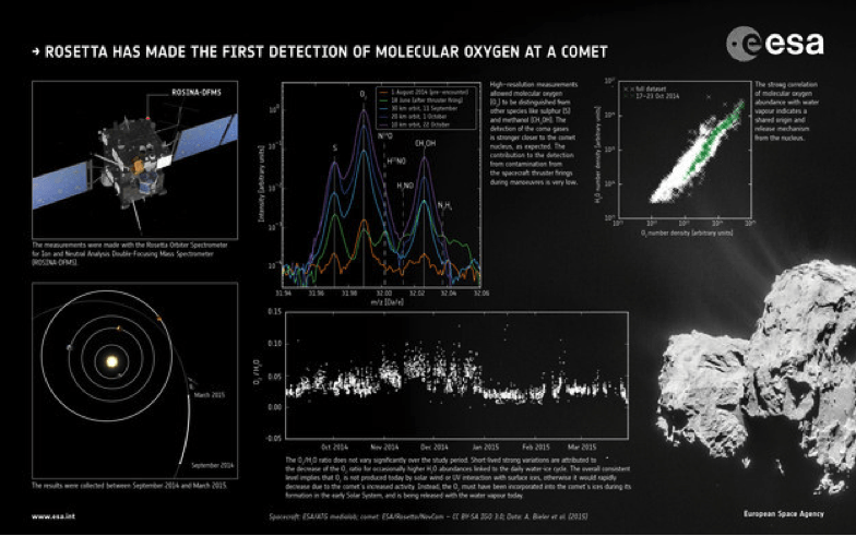 La sonda Rosetta dell’ESA ha fatto la prima rilevazione in situ di molecole di ossigeno nei gas rilasciai dalla cometa, vicino alla quale sta viaggiando allontanandosi dal sole.