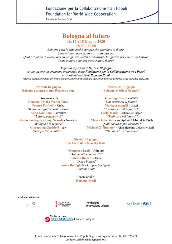 La Fondazione per la Collaborazione tra i Popoli, presieduta dal Prof. Romano Prodi, ha organizzato tre incontri – in streaming – su “ Bologna al futuro, così da poter riflettere, in modo ampio ed approfondito, anche sul futuro della nostra città.