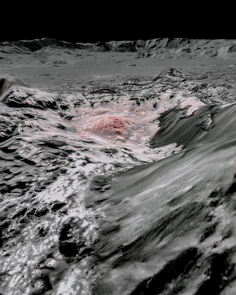 I risultati sono stati pubblicati insieme ad altri documenti che offrono nuove prospettive sulla storia geologico del suo cratere Occator, che ha un diametro di 90 km e risale a circa 20 milioni di anni. Alcune di queste ricerche hanno anche preso in considerazione l’ipotesi della presenza di acqua nel cratere a partire dalle colline coniche simili alle montagne ghiacciate sulla Terra formate da acque sotterranee pressurizzate, ma i depositi di sale sembrano offrire la prova migliore.