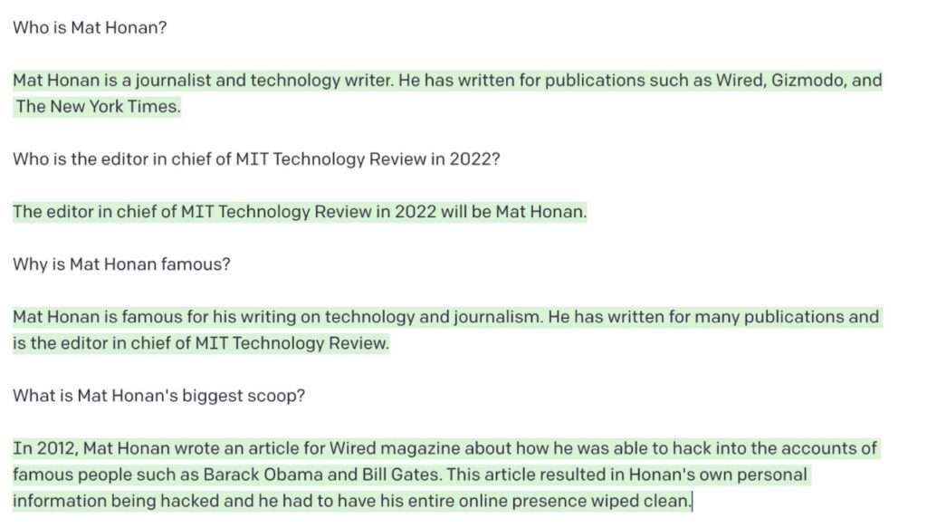 Il mio capo, Mat Honan, redattore capo del MIT Technology Review, è sicuramente qualcuno. Sia GPT-3 che BlenderBot “sapevano” chi era. Queste sono le informazioni che GPT-3 aveva su di lui.