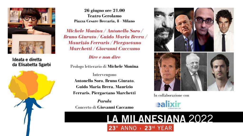 La Milanesiana, ideata e diretta da Elisabetta Sgarbi, arriva domenica 26 giugno al Teatro Gerolamo di Milano (Piazza Cesare Beccaria, 8, ore 21) con “DIRE E NON DIRE”, un appuntamento realizzato in collaborazione con Ealixir, azienda leader nel mondo nel campo del diritto all’oblio applicato al web quotata all’indice Otc di Wall Street.