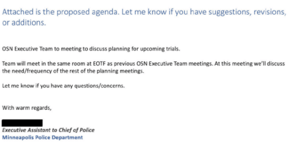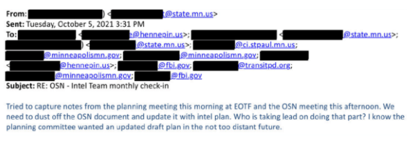 Tuttavia, diverse catene di posta elettronica esaminate a ottobre includevano riunioni di “OSN Communications”, “OSN Executive Team” e “OSN Intel Team” relative ai preparativi per le proteste che sarebbero potute nascere in relazione al processo di Kim Potter, l’ufficiale che ha ucciso Daunte Wright, così come nei casi dei processi per gli altri tre ufficiali che sono stati accusati di crimini in connessione con l’omicidio di George Floyd. (Il mese scorso, Potter è stato riconosciuto colpevole di omicidio colposo e condannato e i tre agenti coinvolti nell’omicidio di Floyd sono stati condannati da un tribunale federale).
