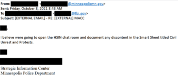 I funzionari hanno affermato che l’operazione sarebbe stata chiusa alla fine di aprile 2021, ad eccezione di alcune riunioni di pianificazione per processi futuri. Tuttavia, le e-mail da luglio 2021 a novembre 2021 ottenute ufficialmente dietro richiesta alla municipalità di Minneapolis mostrano che OSN è rimasta attiva e in segreto ha emesso direttive su come gestire le proteste che non avevano nulla a che fare con l’omicidio di George Floyd o ai processi degli agenti coinvolti.