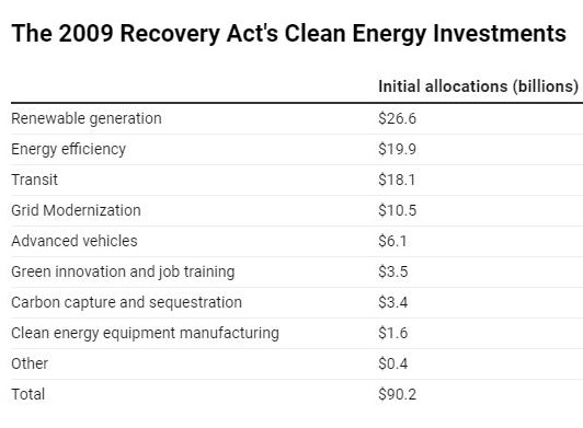 Il Recovery Act ha inoltre investito oltre 6 miliardi di dollari per sviluppare batterie, biocarburanti e veicoli ibridi ed elettrici avanzati, oltre a altri 3,5 miliardi di dollari per l’innovazione verde e la formazione professionale, compresi 400 milioni di dollari per ARPA-E, un’agenzia federale creata per sostenere la ricerca e lo sviluppo di energia pulita nelle fasi iniziali.
