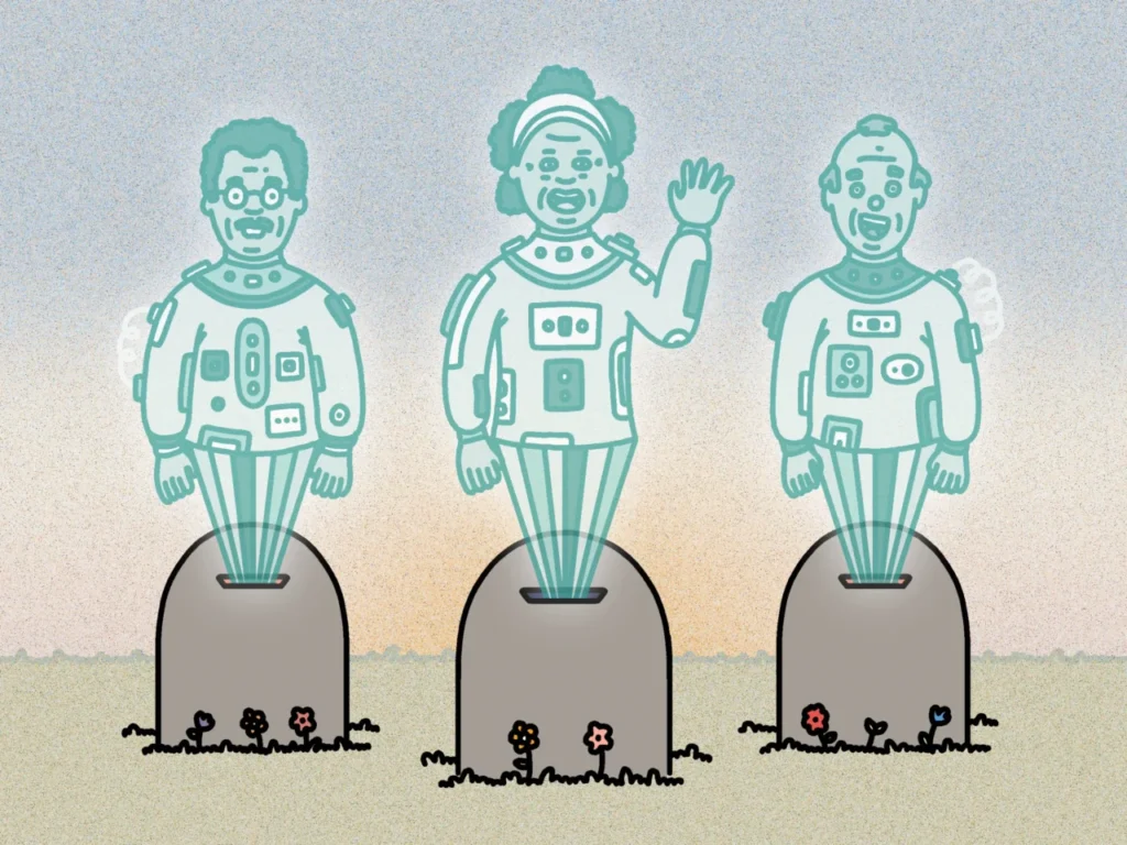 C’è forse un’ultima cosa da provare. Si tratta di un’altra IA. Questa è curata da voi stessi, utilizzando tutta una vita di materiale digitale: i vostri video, testi, post sui social media. È un ologramma, che sta con i vostri cari per confortarli quando non ci siete più. Forse servirà anche come marcatore per la vostra sepoltura. “È un po’ forte pensare ai cimiteri del futuro che sono letteralmente infestati da ologrammi attivati dal movimento”, dice Recuber.