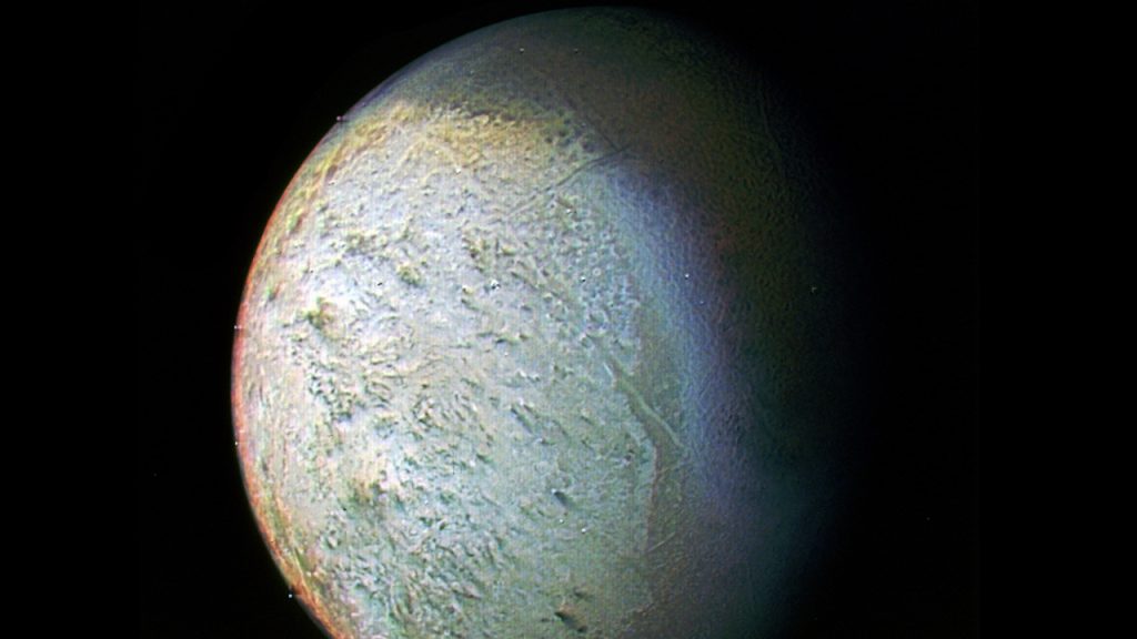 E’ la luna più grande di Nettuno e uno dei mondi più esotici del sistema solare. È una delle sole cinque lune del sistema solare note per essere geologicamente attive, come dimostrano i suoi geyser attivi che emettono gas azoto sublimato. La sua superficie congelata è per lo più azotata e la sua crosta è fatta di ghiaccio d’acqua e ha un mantello ghiacciato. Ma nonostante ciò, sembra ricevere del calore generato dalle forze di marea (attrito gravitazionale tra Tritone e Nettuno), e questo potrebbe aiutare a riscaldare le acque e dare origine alla vita attraverso qualsiasi sostanza organica che potrebbe esistere sulla luna.