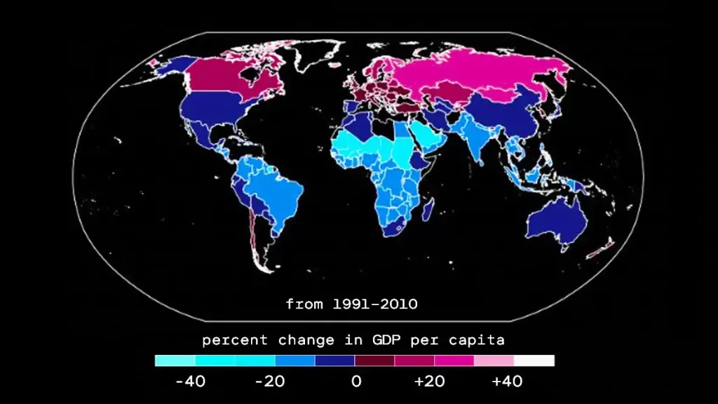 Secondo lo studio pubblicato su Proceedings of the National Academy of Sciences, dal 1961 al 2010, l’innalzamento delle temperature ha comportato il taglio del PIL individuale nei paesi più poveri dal 17% al 31%. Questo effetto ha contribuito all’inasprirsi del divario economico fra paesi poveri e paesi ricchi di oltre il 25% in più rispetto a “un mondo senza riscaldamento globale”, rallentando una transizione altrimenti positiva verso la riduzione della disuguaglianza in quella stessa metà di secolo.