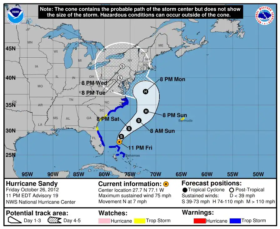 Si direbbe che l’uragano andrà crescendo fino a diventare un mostro che ingoierà tutto il territorio compreso fra Washington, Toronto e Boston; una lettura tutt’altro che corretta. In realtà, la mappa mostra una serie di percorsi possibili che la tempesta (in questo caso, la Supertempesta Sandy del 2012) potrebbe seguire nell’arco dei cinque giorni successivi. La regione colorata di azzurro rappresenta le proiezioni per i 3 giorni successivi, mentre quella puntinata rappresenta le proiezioni per il quarto e quinto giorno; i cerchi neri all’interno di queste regioni, infine, indicano il percorso più probabile dell’occhio del ciclone. Le lettere al loro interno indicano una tempesta tropicale (S) o un uragano (H).