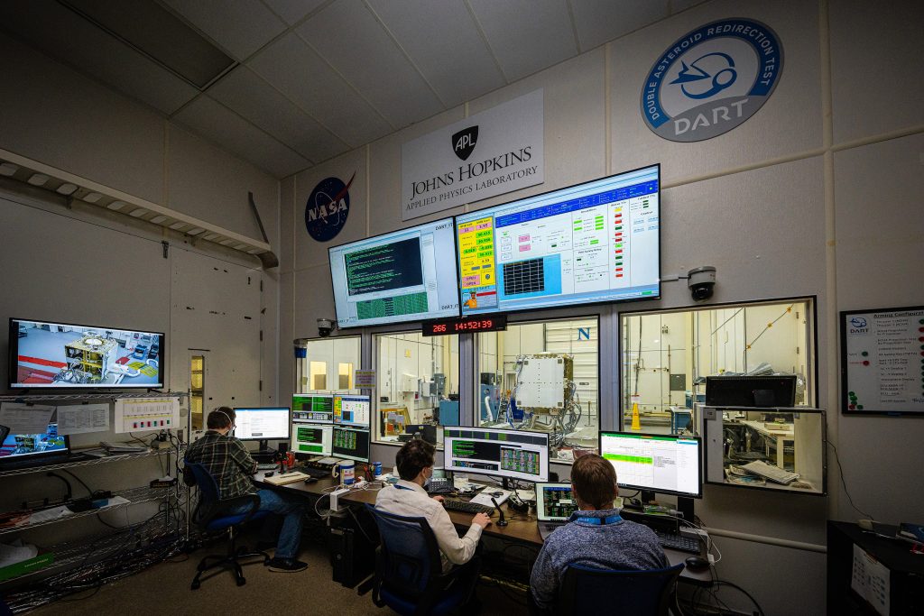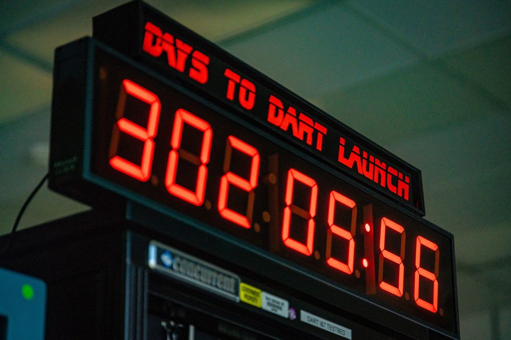 Un orologio su uno dei computer dice: “Giorni mancanti al lancio di DART: 350: 08: 33”.