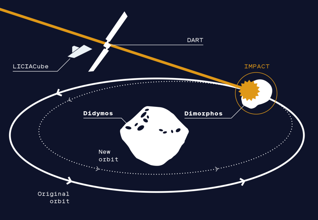 LICIACube si separerà da un compartimento in cima a DART 10 giorni prima dell’impatto e dispiegherà i suoi piccoli pannelli solari. Mentre il cubo piccolo riprenderà le immagini, DART colpirà Dimorphos. La navicella sarà probabilmente frantumata in pezzi molto piccoli, alcuni trasformati in polvere. La maggior parte dei suoi resti verrà nuovamente espulsa quando il cratere si sarà formato. È possibile che parti strutturali possano resistere, anche se saranno sepolte fino a 3 metri di profondità nell’asteroide.