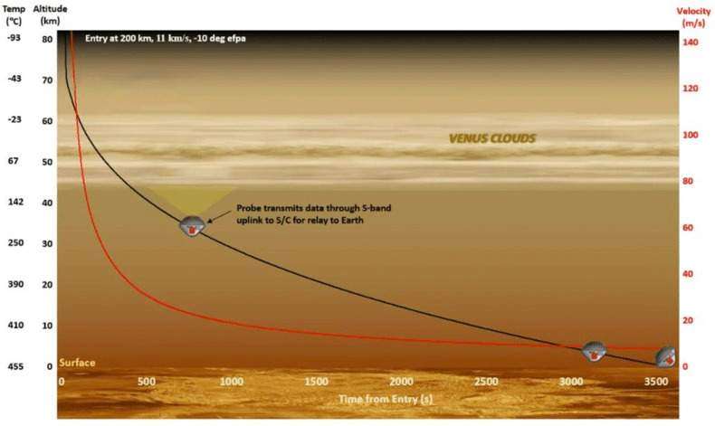 In piena caduta, la sonda avrà solo cinque minuti tra le nuvole di Venere per condurre il suo esperimento, trasmettendo via radio i suoi dati alla Terra mentre precipita verso la superficie. Ulteriori dati potrebbero essere presi al di sotto delle nuvole, nel caso la sonda dovesse sopravvivere. La sonda colpirà il suolo di Venere un’ora dopo esse entrata nella sua atmosfera. I ricercatori si aspettano di perdere il contatto molto prima dell’impatto.