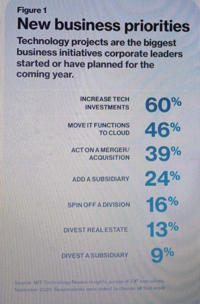 Il cambiamento è particolarmente vero per le aziende in due diversi settori, tecnologia e produzione, che stanno pianificando importanti iniziative imprenditoriali per prosperare in un trasformato panorama aziendale. La pandemia ha accelerato le tendenze che erano già in corso e molti dirigenti d’azienda stanno pensando ai prossimi passi.