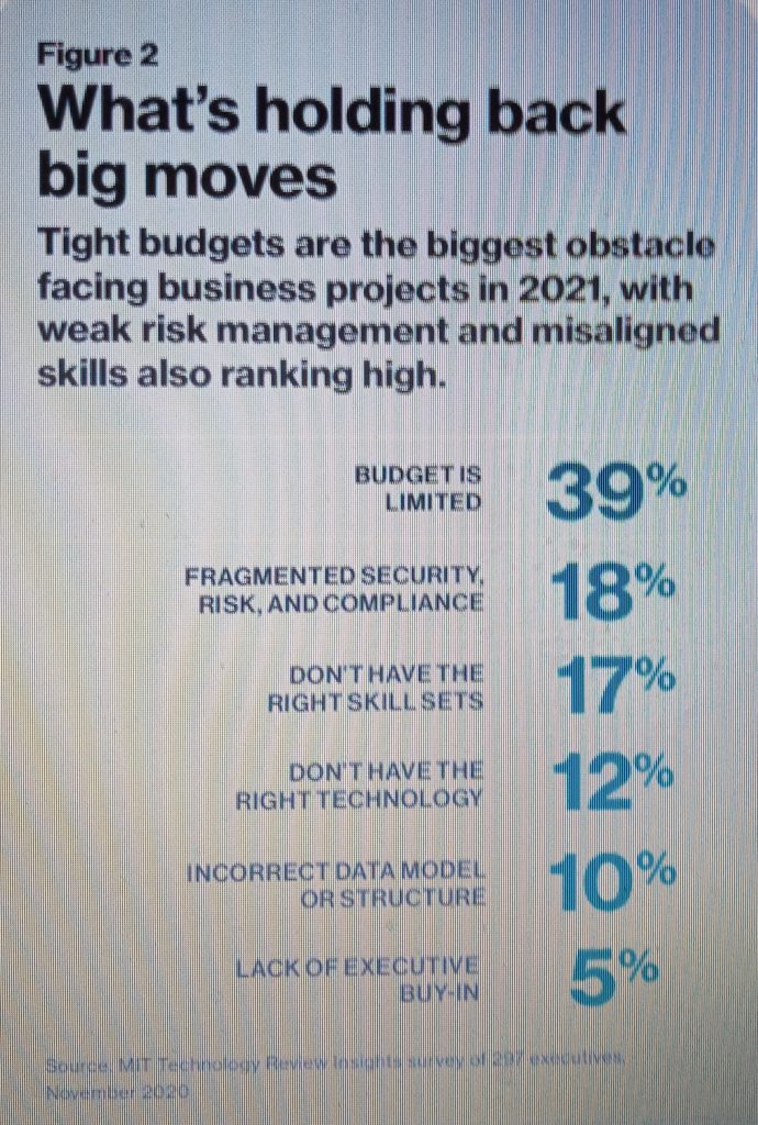 Nel novembre del 2020, “MIT Technology Review Insights” ha intervistato 297 dirigenti, principalmente esperti di finanza e leader della tecnologia dell’informazione che lavorano in decine di settori industriali. Quello tecnologico, il più grande, è rappresentato al 20 per cento, seguito dai servizi finanziari, al 15 per cento, i servizi professionali al 13 per cento e e vendita al dettaglio e produzione, ciascuno all’8 per cento.