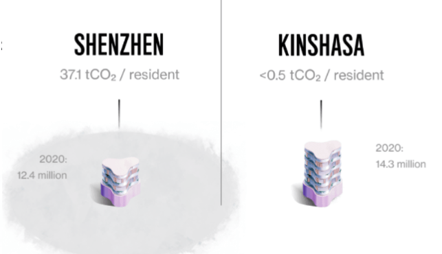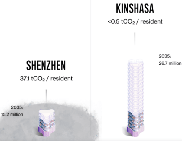 Queste metropoli, come molte altre città nei paesi in via di sviluppo, dovranno affrontare maggiori avversità climatiche nonostante abbiano una minore impronta di carbonio. La popolazione di Kinshasa, per esempio, è simile a quella di Shenzhen oggi. Tuttavia, la differenza nelle loro emissioni di carbonio pro capite mostra l’impatto sul clima sproporzionatamente elevato dei residenti di Shenzhen (si veda figura 4).