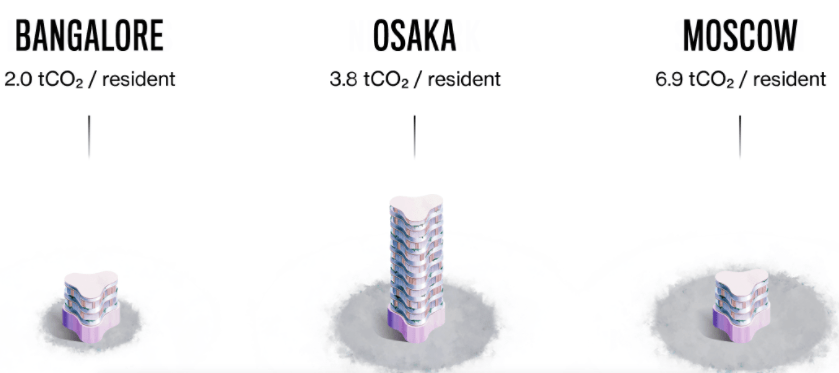 Questo è vero per le tre città con la maggiore impronta di carbonio pro capite: Shenzhen, Cina (si veda figura 2) e le due aree metropolitane più popolose degli Stati Uniti: Los Angeles e New York. Le impronte di carbonio pro capite di ciascuna di queste tre ricche megalopoli sono da 4 a 8 volte quelle di Bangalore, Osaka e Mosca, che hanno popolazioni simili (si veda figura 3).