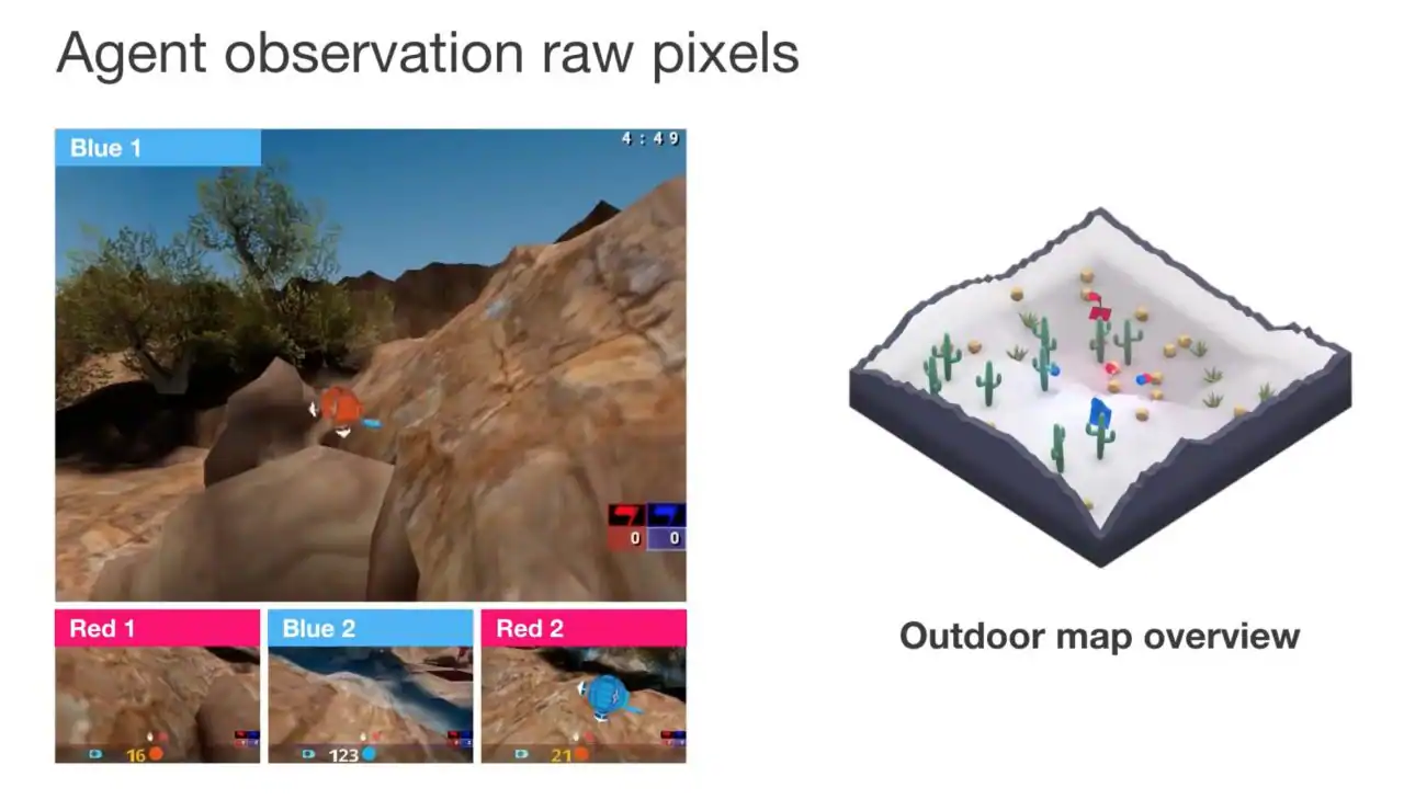 Giocare assieme: I ricercatori di DeepMind hanno addestrato squadre composte da intelligenze artificiali nel gioco di rubabandiera ricreato all’interno di una versione modificata dello sparatutto Quake III Arena.