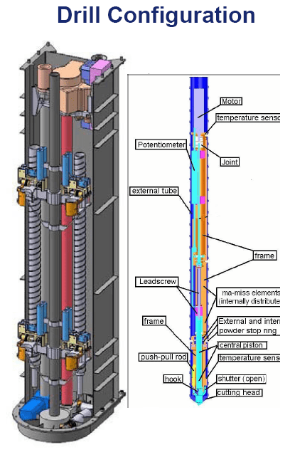 Ma a differenza di Rosetta, questo braccio meccanico sarà modulare perché dovrà arrivare fino a 2 metri di profondità. Sarà costituito da tre aste che verranno progressivamente montate sull’asta che termina con la punta di perforazione e campionamento. In caso di danneggiamento della prima punta, sarà possibile estrarre una per una le aste impiegate, sostituirla con una punta di scorta e calare nuovamente il sistema nel foro rimontando progressivamente le singole aste.