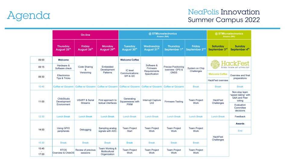 Dopo il successo delle precedenti edizioni, il campus sarà in modalità mista: online i primi 3 giorni, mentre i 6 giorni successivi si svolgeranno in presenza presso la sede di Napoli di STMicroelectronics.