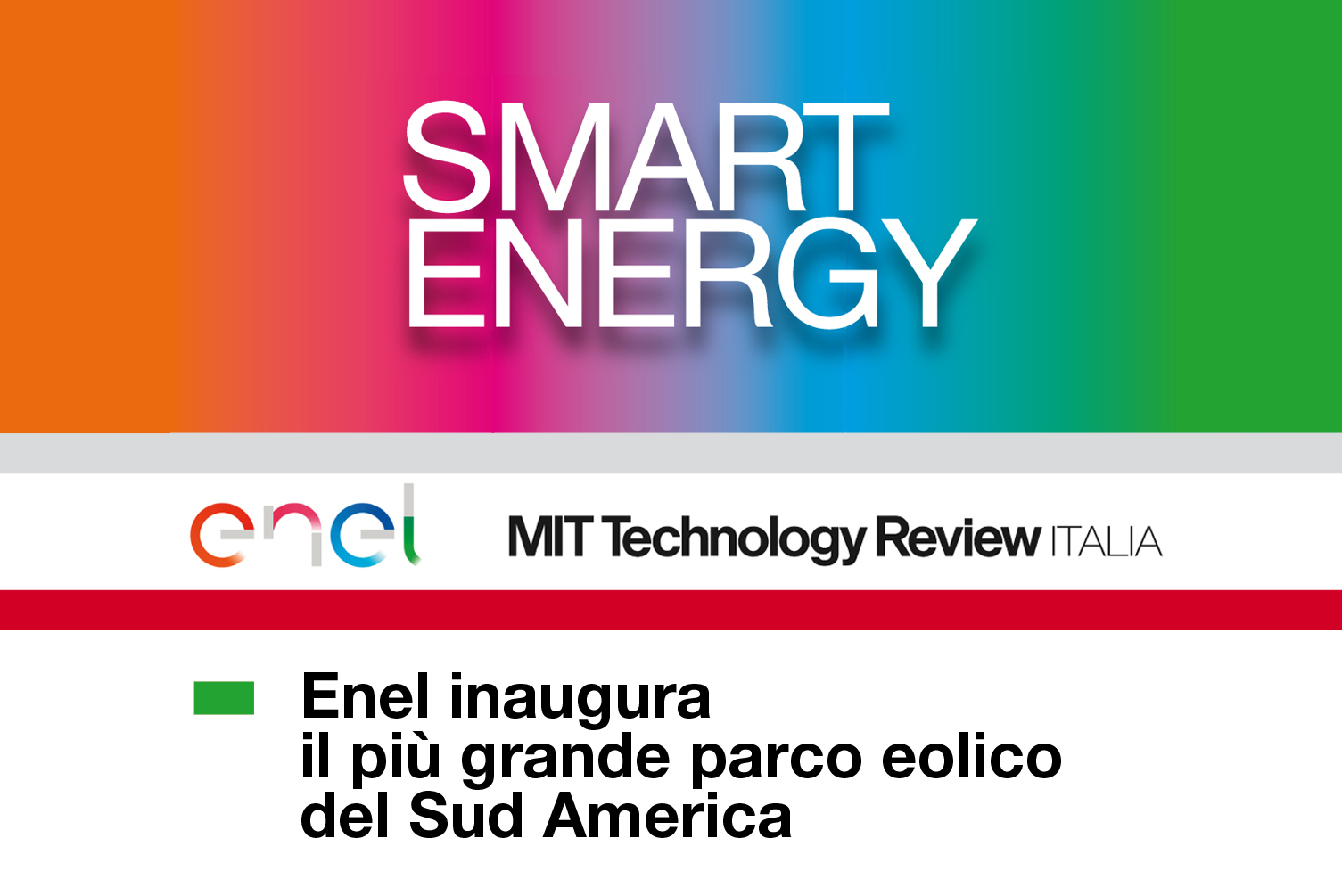 Energia Enel inaugura il più grande parco eolico del Sud America Enel ha investito una cifra pari a quasi 620 milioni di euro nella costruzione…Fonte Enel14/06/2021