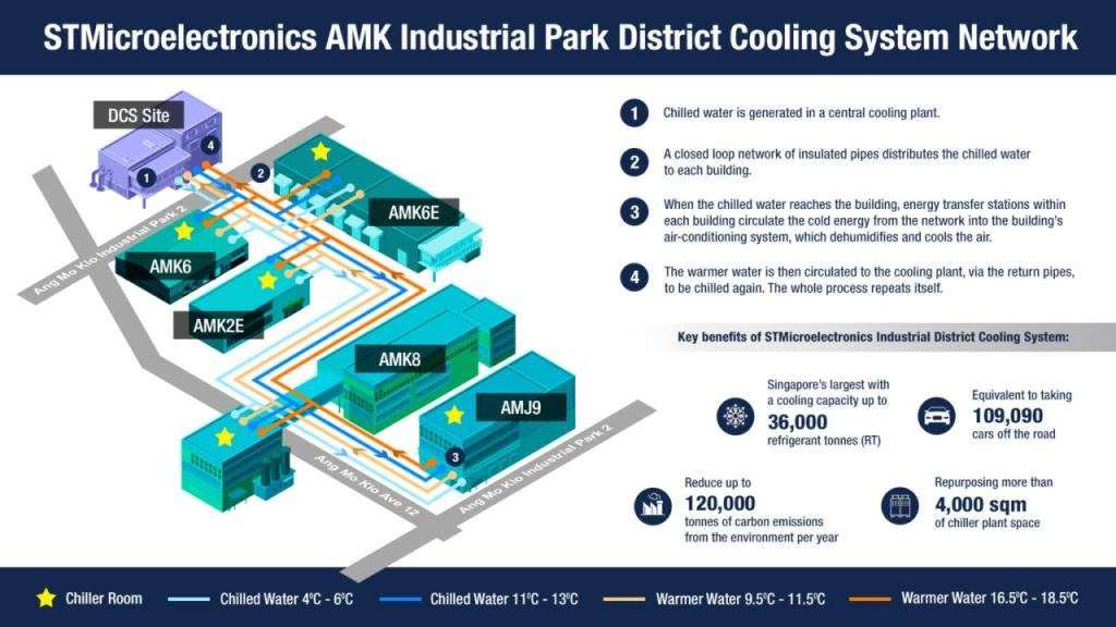 Il TechnoPark Ang Mo Kio (AMK) di ST, a Singapore, vanterà il più grande sistema di teleraffrescamento (DCS) del paese, con una capacità di raffreddamento che arriva alle 36.000 tonnellate di refrigerante.