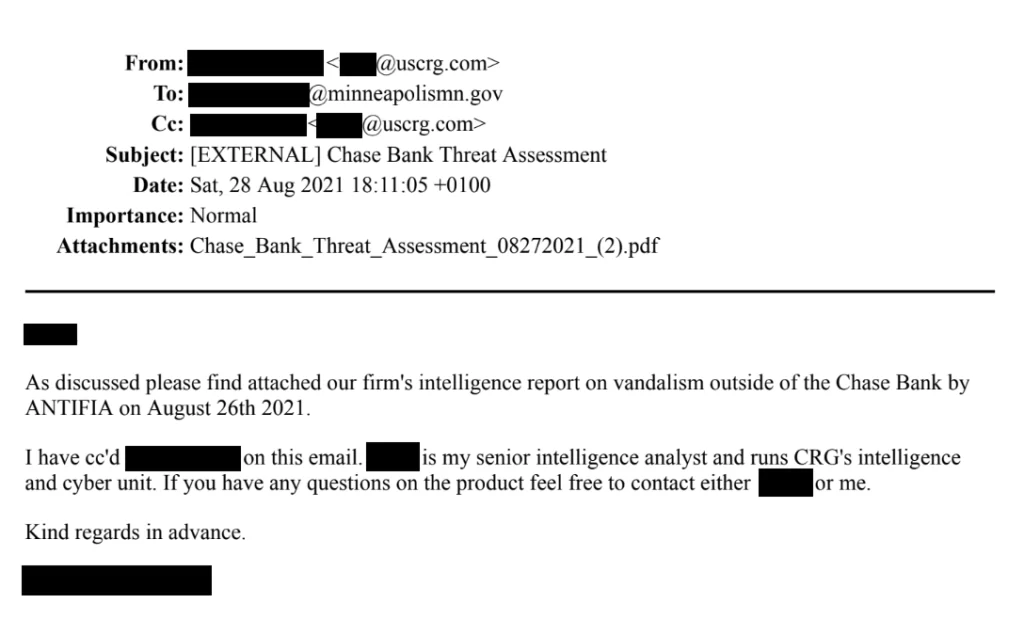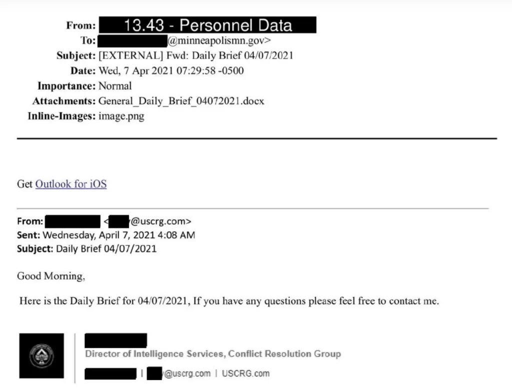 I documenti rivelano che CRG ha regolarmente fornito alla polizia di Minneapolis informazioni sugli attivisti che a volte erano false e politicizzate. CRG ha anche intimidito i manifestanti e ha rivelato la loro identità, violando il diritto alla protesta anonima definito dalla Corte Suprema come attività costituzionalmente protetta. Il dipartimento di polizia di Minneapolis ha avuto contatti con questo gruppo anche per altre attività, nonostante le preoccupazioni all’interno del dipartimento su alcuni comportamenti di CRG.