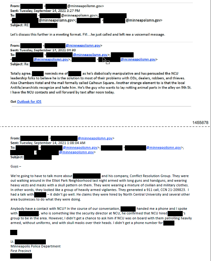 Gli ufficiali del dipartimento di polizia di Minneapolis sembravano avere delle riserve su CRG e sul suo CEO, Seabrook. Il 14 settembre 2021, un ufficiale ha inviato un’e-mail interna dicendo che il dipartimento doveva “approfondire la conoscenza di Nathan Seabrook e del suo gruppo, il Conflict Resolution Group, che sembrano soprattutto vigilantes armati dalla testa ai piedi”. Un altro ufficiale ha definito Seabrook “diabolicamente manipolatore, Vorrebbe lasciare resti di animali in decomposizione nel vicolo della 9th St, per dissuadere le persone dal soffermarsi in uno spazio in cui presumibilmente si commercia droga.