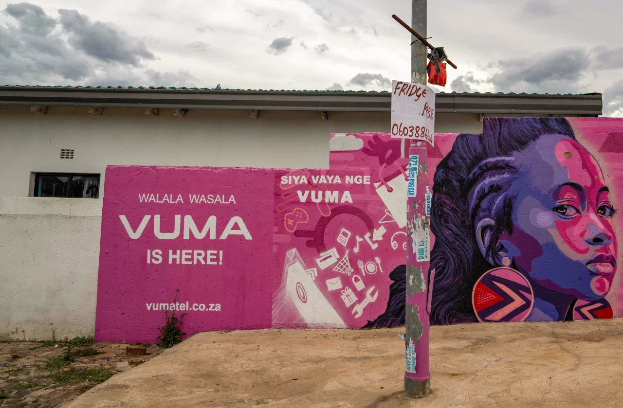 Un murale appena fuori Vilakazi Street pubblicizza l'arrivo della fibra Vuma a Soweto,…